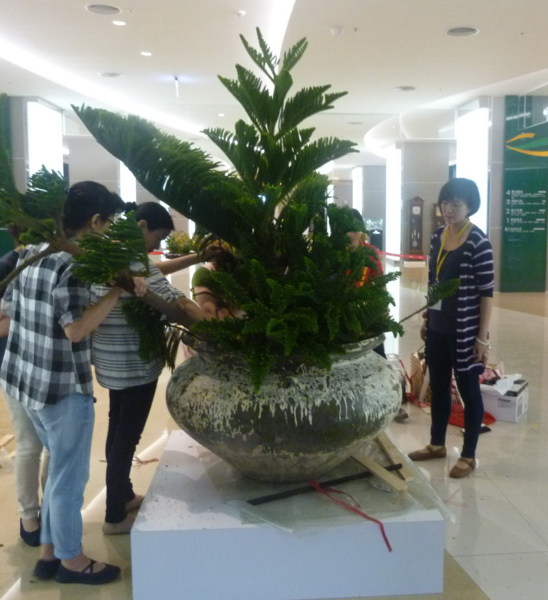 電鑽,在一群學生手忙腳亂中將五枝才剪過的南洋杉交錯安置於甕中後,