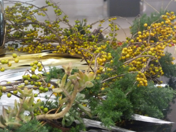 台周圍形成一個大花環,再將小盆栽分散至於花環中,最後再將松枝分解