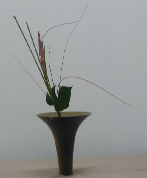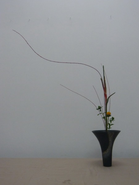 花材:紅柳半把 蝴蝶蘭1枝 電信蘭2片 小鶴蕉1支 薊花1支