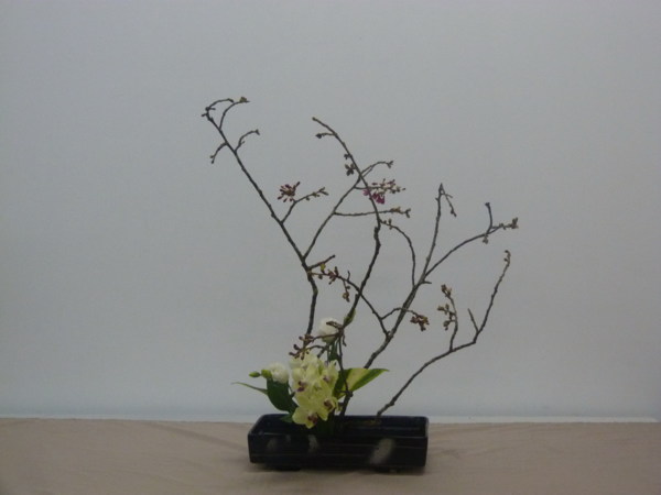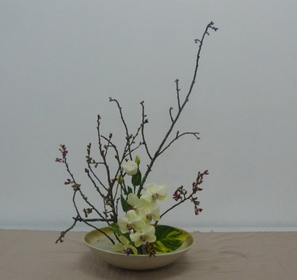 花材:櫻花1把 蝴蝶蘭1支 白桔梗1支 黃金葛葉2片
