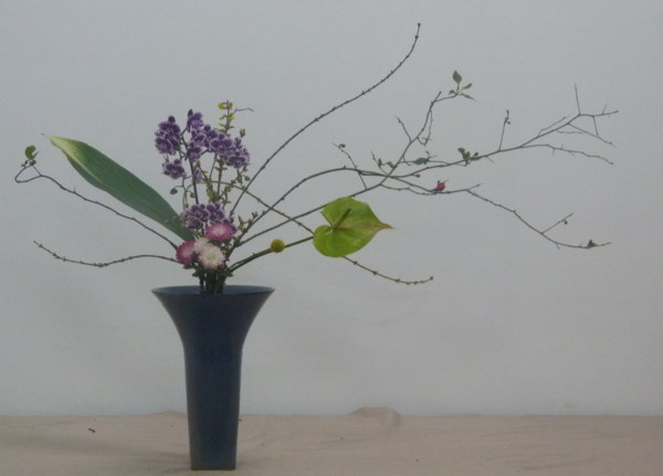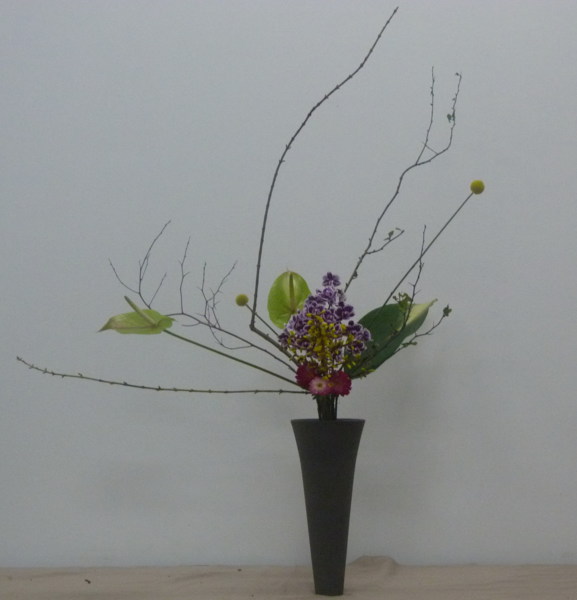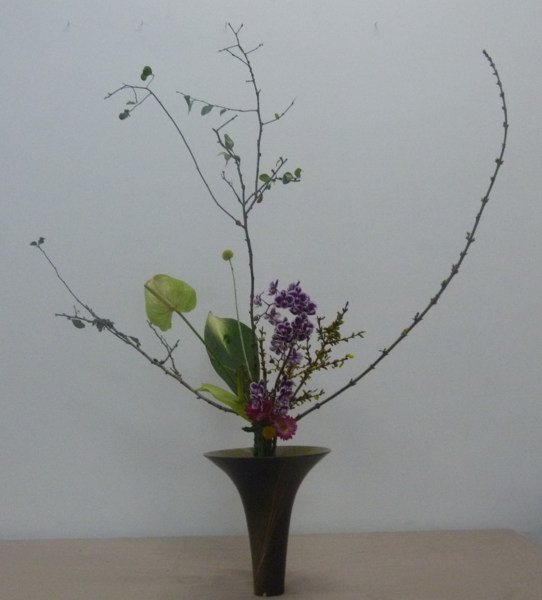 重點:1.連翹短之使用於下段盛開的黃襯托紫蝴蝶蘭為花型的