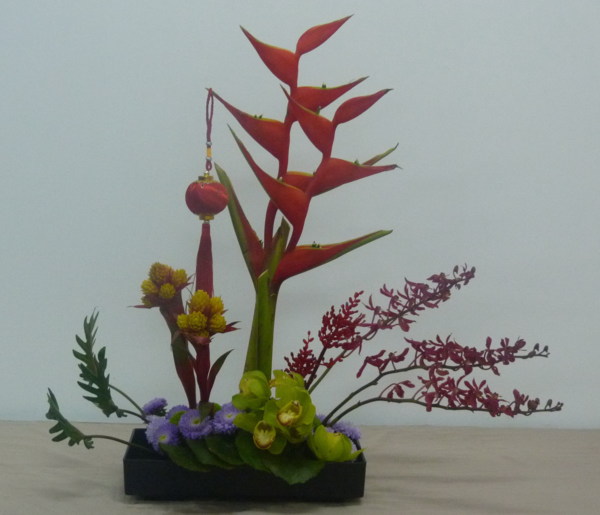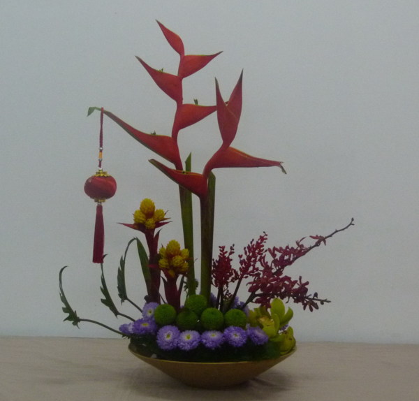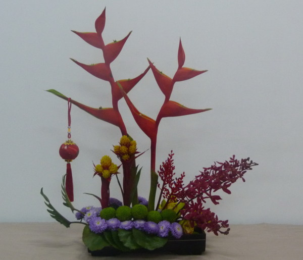 3.珊瑚鳳梨與耀勝蘭花以紅色塊狀置於鶴蕉的另一側。