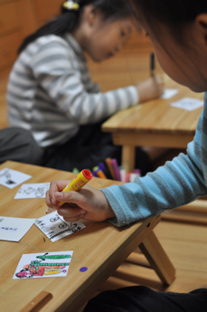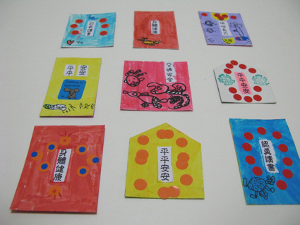 讓她們在紙卡上畫出平安符。