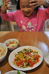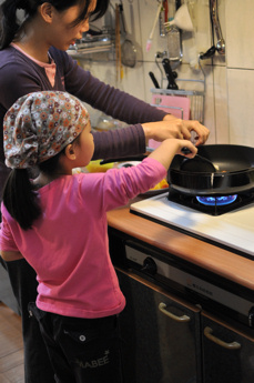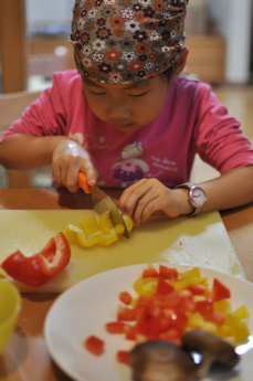 作者:Selena 和她們在廚房裡打滾有好長一段時間,我總是按部就班,一點一滴地讓她們接近廚房。她們小的時候,我是不讓她們接近廚房的,因為我覺得廚房裡有太多無法預估的危險性。在「面對孩子,你堅持什麼」一文中,我提到:廚房有火、有利刃、有滾燙的熱水...。所以我不讓小小孩接近廚房,除非我要上一堂親子廚房的課程。 三歲過後,我開始左右姊妹的「親子廚房樂事」,我有足夠的把握,她們的雙手細動作成熟,她們不再哭哭啼啼,情緒不穩定,這樣完整穩定的情況下我讓她們開始親近廚房,因為我知道每一個食材都可以在廚房裡找到百分百變化的可能性,她們當然也有權力見證這種美食的魅力。 當然我不是一個美食專家,我更不是一個烹飪高手(我媽媽倒是),但我懂得品嚐每一樣菜餚帶來的氣氛,我願意去感覺食物在口中的每一種滋味層次。所以左右姊妹從洗菜、洗米、撕荳莢、煮紅豆、做果凍、桿麵團、包餃子、ㄔㄨㄚˋ籤...這種手作基礎功,到做三明治、土司披薩、佈置早餐、搓特色湯圓...這種創意隨性的個人化食物設計,這兩年來她們做了很多,在廚房是個游刃有餘的二廚,但我遲遲不敢讓她們拿刀,因為我還是擔心她們會「不小心」受傷,我還是不願意大膽嘗試任何一個危險,一直到五歲過後,zoyo已經在我的允諾下,慢慢拿起那把小孩專用的廚房刀。 一年前就選了一把不利的小孩廚房刀,放著讓她們觀賞,總要她們先對這把刀不緊張,才能好好切菜吧!這一天中午參加婚宴回來後,我們傍晚開始一場小廚師做菜實作,今天所有菜餚都要左右姊妹自己完成,仔細看看今晚的菜,有高麗菜、紅蘿蔔、紅椒黃椒、蕃茄、豌豆莢...,都是蔬菜類非常好處理。左右小廚師要做的事可多囉,她們必須: 1.自己洗米、量米,下鍋煮飯 2.自己洗高麗菜 3.撕豌豆莢 4.切各種蔬菜 5.打蛋攪蛋 6.炒菜、煮湯 要注意: 1.教孩子切菜時,要告訴她們彎手指、收手指,千萬別五隻手指攤出去,很危險。 2.初次切菜的孩子,可以選擇葉面較軟的蔬菜,像是小白菜。 3.如果要切像是紅椒、黃椒,記得呈碗形切菜,別呈帽型切菜,因為椒類表面較滑,容易打滑切到手。