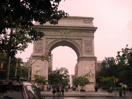 當我們走到華盛頓廣場(Washington Square)附近的時候,聽到有好些人在唱歌,有點像是在唱愛國歌曲,心想下雨天,怎麼還有這麼高的興致呢? 廣場上其實是像一個小公園,花木扶疏,有一個白色的城門,兩旁的柱子上有兩個浮雕,看起來很眼熟,但卻一時說不出來,是哪位偉人? 好像和美鈔上面的人像類似。
