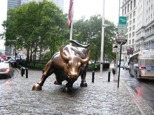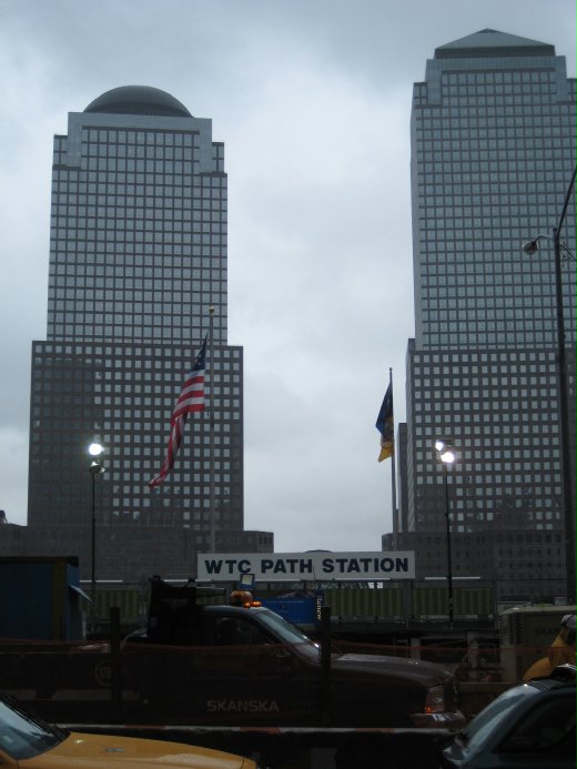 達成E線地鐵,到終點站是WTC (世貿中心),當年兩棟直聳入雲霄的大樓今已經煙消雲散,留下不知多少的思念與悲哀。從這沿著百老匯大道往海邊走去,一路上摩天大樓聳立,還看到青銅牛一隻,鎮守在馬路中間,遠遠就看到要去自由女神像的搭船碼頭。