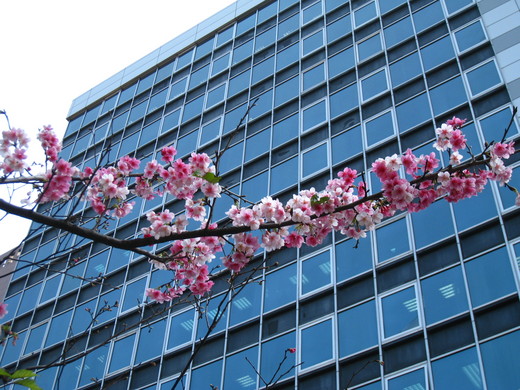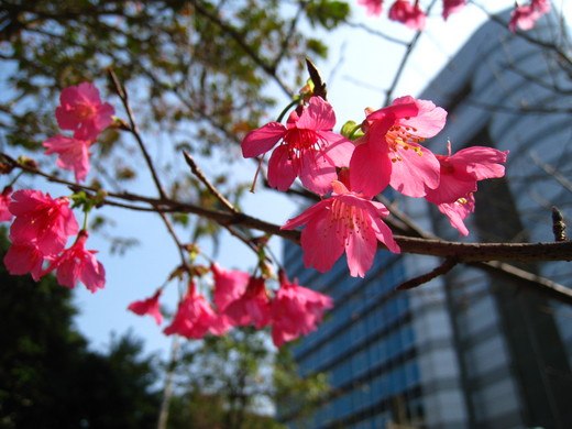 緊臨吉野櫻花樹,旁邊盛開的是緋寒櫻,顏色較紅,在艷陽下,背後襯托的玻璃帷幕的大樓,旁邊就是7-11便利商店,原來春天就在你我身邊,無須尋尋覓覓,俯首可拾。趁的這大好春光,好好的欣賞這大自然的美景,櫻花開的很短暫,一年就只有這短短的春天,讓它能盡量的發揮它的美艷,讓人看見她的美好!