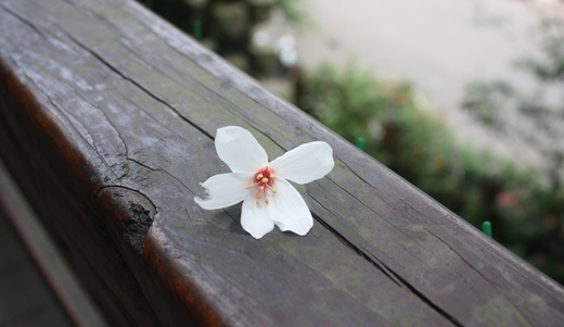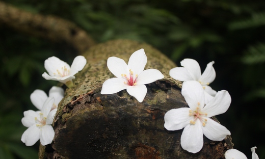 今天已經是桐花活動的第二天,顯然昨日的人潮,已經將桐花地毯的景致,一掃而空,留下片片桐花印在春泥中, 山頭上倒是還有不少盛開的桐花樹,只能遠觀,不得親近. 沿著清溪步道,踏著石階,沿路上還留下些許的花蹤,還有小溪流中的桐花,落花流水,別有一番不同的景致.