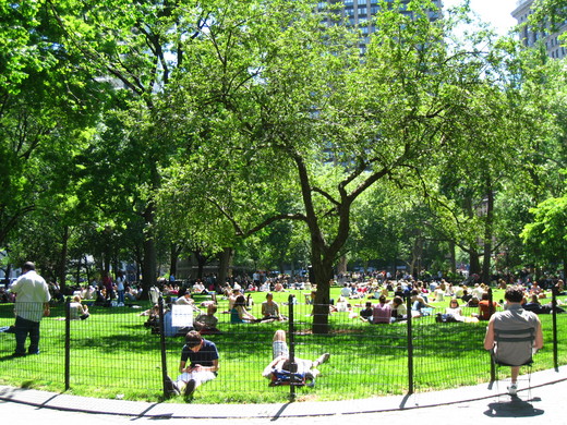 到紐約後的第一天,天氣好的不得了,陽光明亮卻不至於讓人感到熱,走在街頭上,看到好多人都躺在麥迪遜廣場公園裡作日光浴,甚至坐在街邊陽光下,喝咖啡或是吃餐點, 絲毫感受不到紐約市向來該有的匆忙與緊張. 走在第五大道上,人潮很擁擠,公園裡的人更多,有街頭藝人的隨興演出,還有人就在街邊,打開餐盒,進行午餐,甚至西裝革履者,邊走邊吃,這種景象,倒是讓我有點大開眼界,或許這是個自由自在的地方,每個人按照自己的模式過日子~