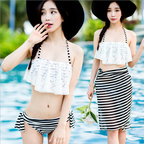 出自:線上購物分享 - 比基尼 溫泉 游泳 泳衣 條紋 三件式泳裝 美胸 薄紗 細肩帶 繞頸 海灘巾 披肩