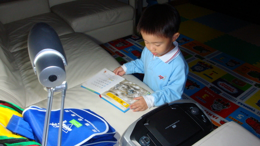 那日接哥哥下課回到家,整個客廳和飯廳的燈不知何故不亮,但是其它房間和插座電源是好的,工人帶弟弟到clubhouse跑跑也不在家,整個客廳一片漆黑,一時也不知如何處理,先點上兩個好久沒拿出來用的浪漫燭台,這時哥哥一心只想著他的唐詩,媽咪只好拿了書桌上的檯燈到客廳,讓哥哥藉著微弱的燈光還能聽CD看書。看著哥哥這番景像,讓媽咪想起西漢著名學者匡衡<鑿壁偷光>的故事,當下又感動得要眼泛淚光了。。。