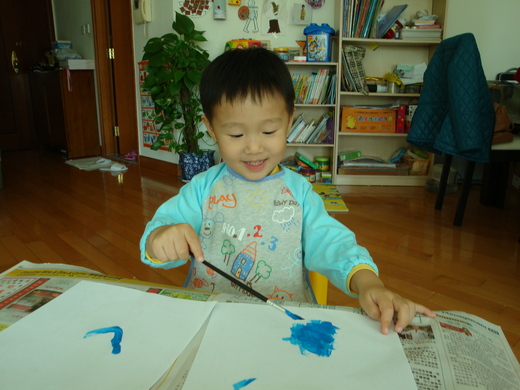 弟弟和哥哥是完全南轅北轍的性格。弟弟可以在一分鐘內換三種不同的遊戲,似乎思考細胞在他腦內流動特別快速(哥哥則是一樣東西可以玩很久)。這天下午弟弟想畫水彩(指定要的),我們當然乖乖幫他把道具準備好,小桌子鋪上報紙,調色盤放上顏色,洗筆的水盒,穿上他的專用衣,他就這麼畫了一個小時,邊畫邊喃喃自語(「我想畫藍色在這裡,還有紅色,然後,好,就這樣吧,還有綠色。。。」),需要時自己到書架上換新的畫紙,開心時還自己唱歌,弟弟的歌聲是又宏亮又高亢。看他的架式真的是別有風範,而且非常樂在其中。