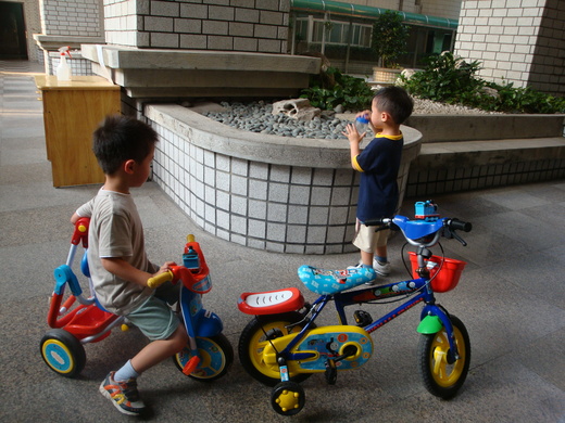 四歲八個月的哥哥,情緒方面穩定很多,早上醒來會自己開燈拿了書或放上CD自己玩一下,不吵不鬧的;早上還需要一瓶奶,而出門也容易溝通多了,會自己換上學校的制服/運動服並背上書包,下課回家洗澡吃飯通常還蠻順利,有時當天太累了,吃完飯還會跟媽媽說:「媽媽我想睡覺了。。。」,每週的感覺統合課,體操課,和圍棋課,目前為止都喜愛。三歲五個月的弟弟這段時間反倒是讓媽媽較為頭痛,晚上睡覺要媽媽陪,早上醒來要媽媽陪著玩,上體操課要媽媽陪在教室內看,雖然他和哥哥也可以玩得起勁,但似乎黏媽媽黏得緊,有時真的>--<。在外面玩但時間到了確不肯回家,吃飯時拖拖拉拉,媽媽講電話或洗衣洗碗時要媽媽停下來陪他玩,如果不答應,脾氣一下就來,哭哭鬧鬧或在地上踢打,為了他霸道不講理又胡亂發脾氣,媽咪在屢勸無效後也會不理他,如果太過份就得修理屁股了。