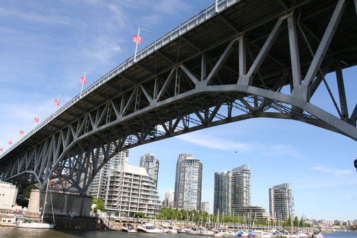 朋友說,帶孩子一定要到Granville Island 一遊。Skytrain的Burrard站離我們只有三分鐘步行的距離,居高臨下的看看這個城市而且沒有塞車的壓力,之後換乘行駛於False Creek(假溪)上的水上巴士(Aquabus)到Granville Island。
