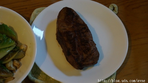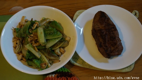 今日晚餐:煎嫩肩里肌牛排(2人一塊),蒜香炒雪白菇+蘿美生菜。