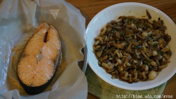 今日午餐:清烤鮭魚,九層塔炒野菇。