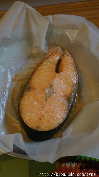 趁好市多特價買的鮭魚輪切,非常肥美,單純解凍後用烤箱160度上下火慢慢烤個30~40分鐘,起來先吃原味,再灑點香菇淡醬油搭配,非常好吃。