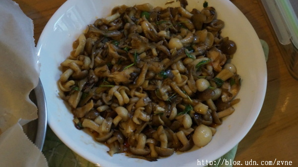 同樣在好市多買的好菇道組合,裡面有舞菇、鴻喜菇、雪白菇,3種各拆一包,用玄米油先炒軟,再加蒜蓉豆瓣醬炒勻調味,最後起鍋前,用現採的九層塔洗淨切碎撒進去炒勻即成。