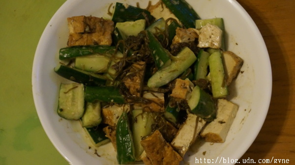 小黃瓜2條拍裂,切成條狀;主婦聯盟買的有機油豆腐3塊,每塊切成6條;之前煮好的常備小菜-昆布絲佃煮適量。