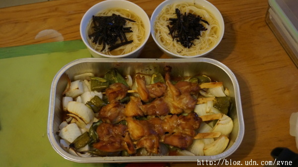 今日晚餐:雞腿肉+雞軟骨烤肉串搭配烤蔬菜,味噌海苔湯麵,難得的甜點巧克力奶酪。