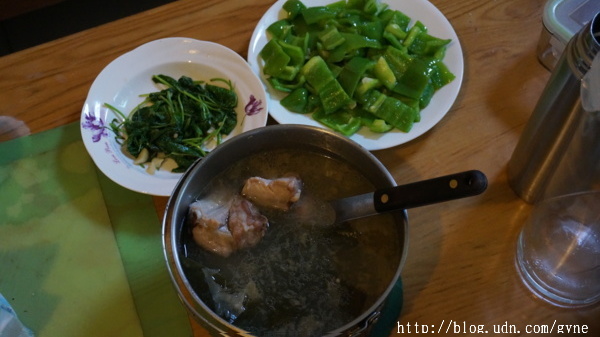 10/1午餐:鹽味炒地瓜葉,魚露炒青椒,昆布冬菜排骨湯。