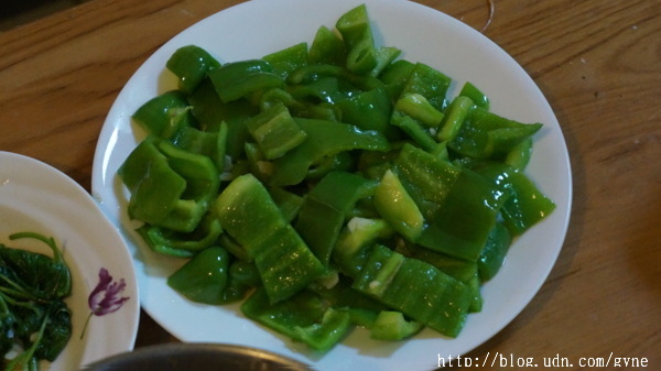 青椒2顆去籽切段,蒜頭2瓣拍扁切末。