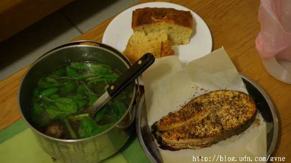 今日晚餐:青江菜香菇湯,香草烤鮭魚,免揉麵團土司。