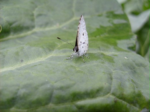 翅膀腹面為灰白色,後翅腹面有五個明顯黑點。後翅