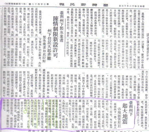 〈請參見本文前後的附圖;前者為昭和五年十二月二十一日的「台灣新民報」的地震消息;後者是昭和五年十二月八日的「台灣新民報」的地震消息;前者刊在昭和六年一月一日,後者刊在昭和五年十二月十三日〉