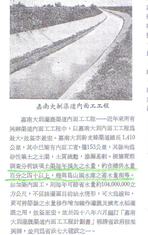 「‧‧‧根據實際調查分析,該項土渠每年損失之水量,約在總供水量百分之四十以上,幾與烏山頭水庫之蓄水量相等。如加築內面工,則每年可節省水量約104,000,000立方公尺,不但該灌溉區目前缺水情形,可大為緩和,更可將節餘之水量移作增加雜作灌溉及擴充水道灌溉之用,效益至宏。」〈可詳見於本文末之貼圖「台灣水利」專文「」,所附之照片與說明〉