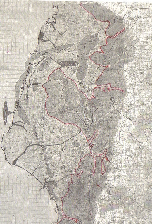 〈圖中紅線為泥人加強的,原書為黑線;那是荷據時內縮的海岸線;圖外圍的黑線是今日台南縣、嘉義縣沿海的海岸線;正是因此泥人研究稱,清廷時代,對於嘉南平原的水利責任不大。〉