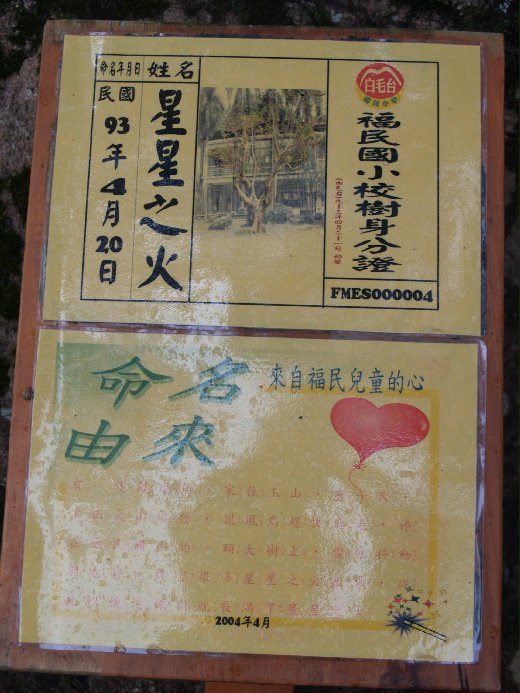 今年暑假,校長即將調往台中縣僑忠國小。訪談結束後,校長一路送我們到門口,顯得依依不捨。回眸和校長道別時,我看見校長身後的老樹,正賣力張開枝椏,擁抱福民的天空。這群九二一地震後屹立不倒的老樹,見證福民的滄桑,也見證福民的新生。深信福民的孩子,會像老樹一樣,牢牢抓住故鄉的土地,他們會記得芳玲校長投注的愛,會大聲驕傲的說:「我來自福民,來自白毛台,我不會忘記對這塊土地的承諾!」