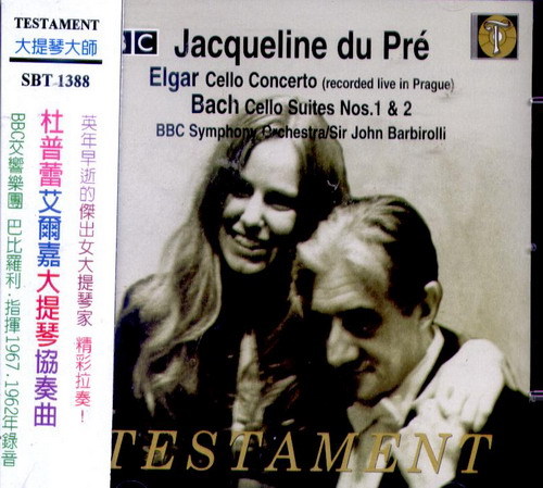 杜普蕾Jacqueline du Pre,英國女大提琴家,1945年出生於牛津,1987年逝世於倫敦,孩童時就開始習樂,12歲就公開在電視上演出,1960年從倫敦市政廳音樂學院獲頒金獎畢業,同年贏得英國女王大賽獎後,1961年正式公開演出,一鳴驚人的成功,1965年在紐約卡內基大廳首度美國演出,大放異彩博得全球好評,1967年與名指揮及鋼琴家巴倫波因結婚,與先生同台演出,1973年被診斷出羅患多重硬化症,就放棄演奏生涯,但在健康狀態下開始碩士班的教學,1979年她得到榮譽博士學位,並成立基金會援助多重硬化症的人,本片的艾爾嘉大提琴協奏曲是首次發表,於1967年三月一日捷克的布拉格演出,珍貴的收存版本。另加巴赫的第一、二號無伴奏組曲,1962年的錄音。