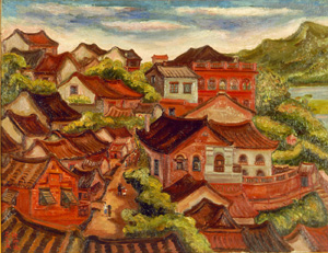 而這樣的現象似乎在「台展」裡的「東洋畫」中就更加明顯了。 「東洋畫」的命名是對照「西洋畫」而定的(「東洋」泛指佛教文化圈的範圍),似有意包容日本畫與傳統的中國文人畫,可惜首回「台展」的評審結果,所有陳舊因襲傳統繪畫,沒有創意的抄襲作品全部落選,只有林玉山〈「水牛」、「大南門」〉、陳進(「姿」、「朝」、「罌粟」)、郭雪湖(「松壑飛泉」)寫實自現實環境具鄉土色彩的作品入選,而獲得第一特選的日人村上英夫的「基隆放水燈圖」更是取擷於台灣民俗風情的題材,這類寫生自週遭環境,發揮台灣鄉土特色的作品,似乎較傳統的文人畫作品更能反映生活的情節,而獲得評審委員的青睞。後來歷屆受邀來台擔任審查的日本名家,不論是在報紙上發表談話感言或專題評論,皆希望台灣的畫家應善加運用本島自然環境特異的景緻,天候所呈現南國炎方特有的顏色,把「蓬萊島之人情、風俗及其生活點點,廣泛地介紹給社會大眾」,發揮在地優勢條件以發展台灣獨具的鄉土風格 「地方色彩」的藝術。就在評審委員要求發展台灣獨特「地方色彩」觀點的主導下,以近代寫實的精神,一筆一畫創作出許多富有台灣色彩、趣味的作品,「創造出具生彩異色之藝術,確立該時代及該地域之藝術地位」(鹽月桃甫,「台展西洋畫概評」,這是台、府展成功之處,同時也是意味著向陳舊因襲傳統的美術告別,朝向台灣新美術發展邁進。
