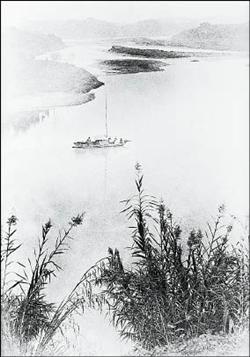 〈蘆岸歸舟〉呈現出的黃昏景色,是郎靜山於一天中不同時間捕捉不同氛圍的代表作之一。
