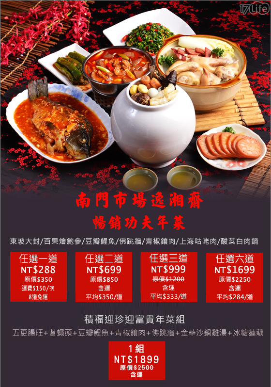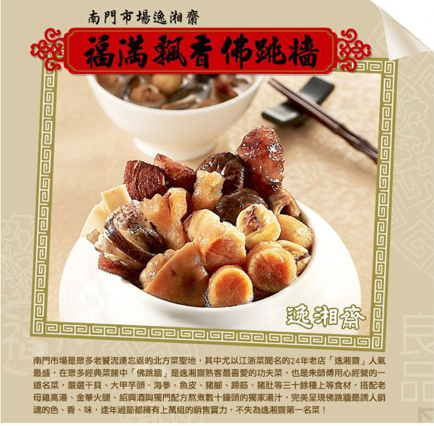 | 南門市場逸湘齋-功夫年菜/年菜組系列-沒吃過這一甕,別說你吃過佛跳牆!積福迎珍迎富貴年菜組,道道經典無法挑剔!新年到,南門市場老店幫你加菜只要288元起即可購得【南門市場逸湘齋】原價最高2500元功夫 售價:288 我要購買 |