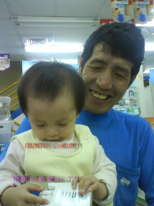 大約6個月大大時,寶貝看上它了,就在阿公胸口上那個口袋!