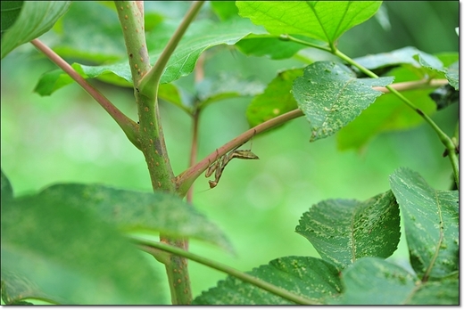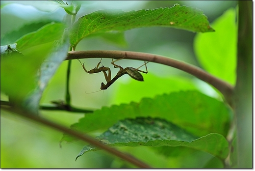 這隻寬腹螳螂 ,我在拍綴葉叢螟的幼蟲時,發現牠躲在葉子背面,角度不對我輕搖葉 片趕牠上葉面,沒想到小傢伙一點也不想理我,拿起相機牠又躲進葉片下,既然牠不配合我只好我配合牠囉,嘿!牠還真是憋扭,等我換邊相機喬好位子,牠老兄不甩我又跑到另一邊去,我到右邊牠跑左邊,我換左邊牠躲右邊,跟我玩起躲貓貓,也罷! 拿出耐心來吧,誰叫我喜歡牠。