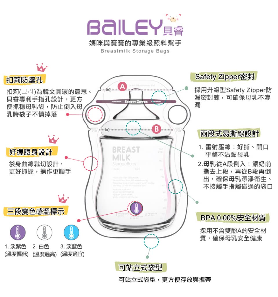 雙11特惠活動,搶到賺到:【韓國BAILEY貝睿】感溫母乳儲存袋-指孔型30入+乳頭保護罩
