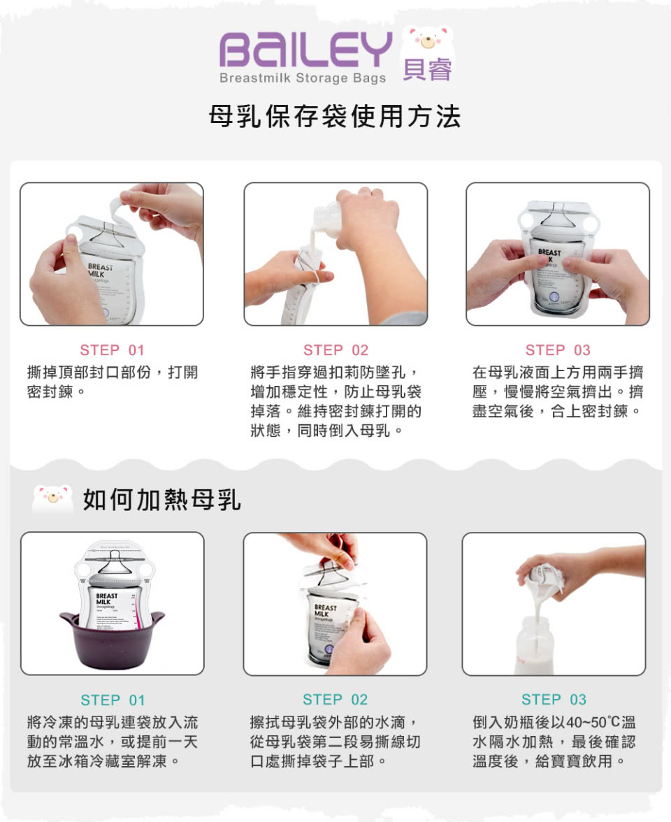 建議使用溫度內加熱使用,也不會釋放化學物質,確保給寶寶的母乳潔淨安全,是BAILEY貝睿母乳儲存袋給媽咪與寶寶的安心保證!