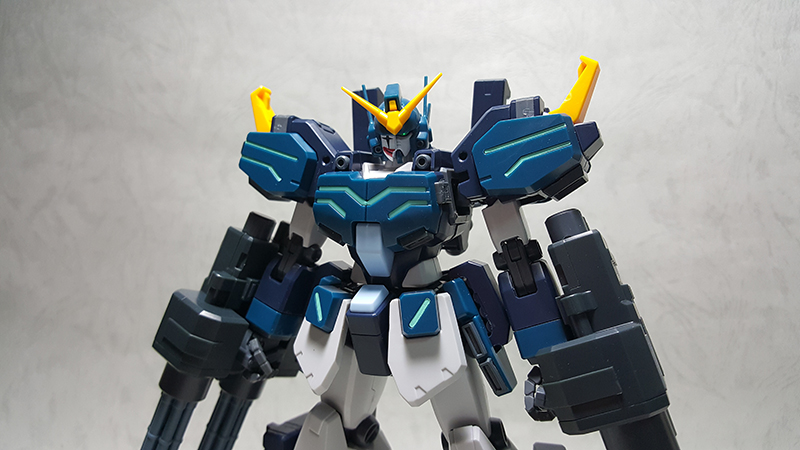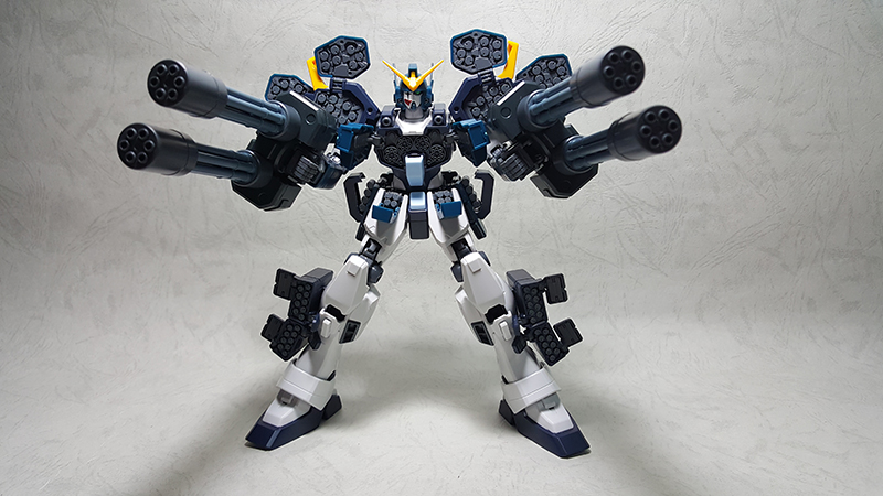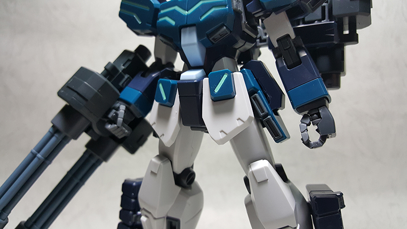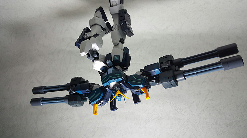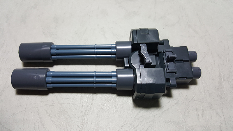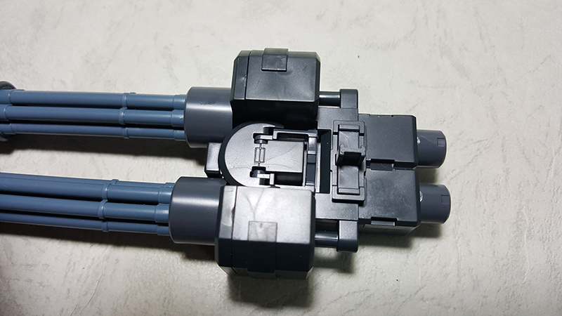 雙管蓋特林機砲內部的握把是可以隱藏收納的,除此之外,握把後面的突起零件可以上下顛倒,分別做為手腕固定以及掛載在噴射背包的接合點使用