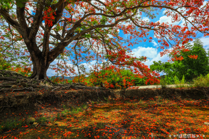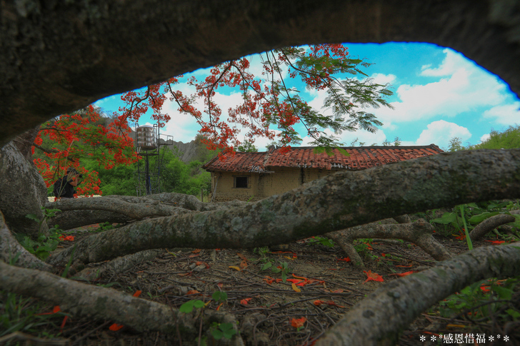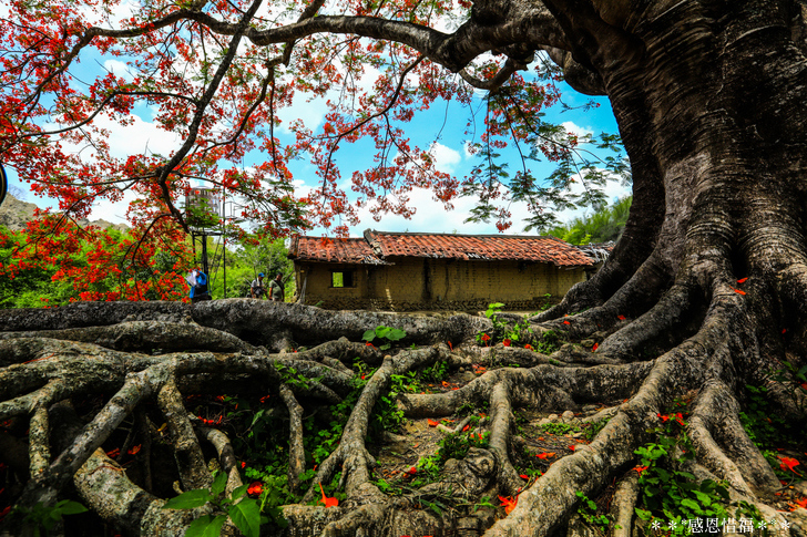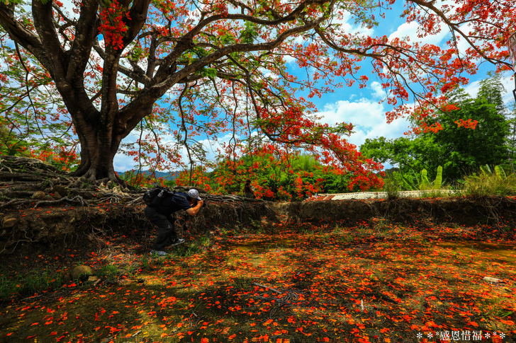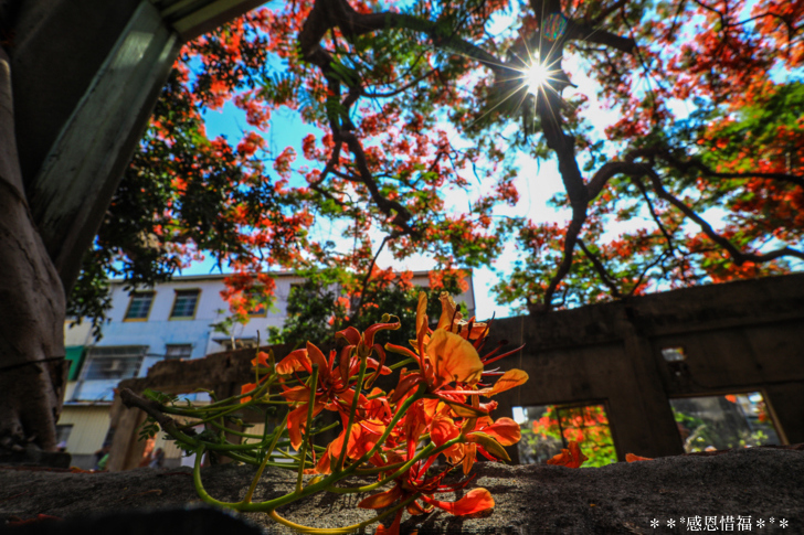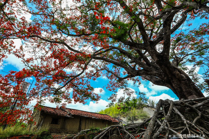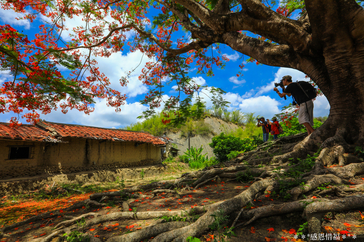 古厝旁的鳳凰木,樹齡超過八十年,竄出土壤的根部,在地表突起、分布的畫面,也很可觀,搭配紅花散落的意境,可以運用構圖,精彩呈現。
