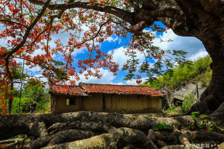 青瓜寮古厝就在左鎮月世界勝景之一的「玉女峰」附近,是山區鳳凰木最熱門的攝影點,除了老屋、大樹,還有泥岩地形可以入鏡,取材元素豐富。(樹縫中隱約可見)