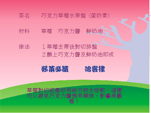 至於我的這道水果盤,哈哈!其實是我兒子的最愛,我則嫌它有一點熱量太高,不過真的很好吃,不怕肥!不妨吮指來嘗吧!
