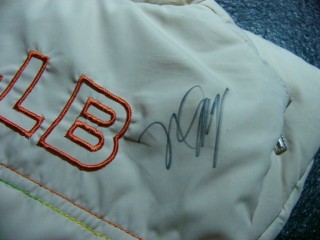 既然哈客李林上線了,那麼今天到底上不上菜呢?別急別急!讓我先秀一下我的戰利品不遲,追星最重要的就是拿到星星的親筆簽名囉,法王在台和一般大眾見面的時候,僅有皈依及灌頂兩個機會,在上千人潮中除了可以跟他有短暫時光的零距離接觸外,根本不可能要到簽名,還好我的關係還不錯,經過內應接濟,總算勉強獲准當成準義工接見,然後~~~終於趁機要到了一份畫在背心肩膀部位的簽名。