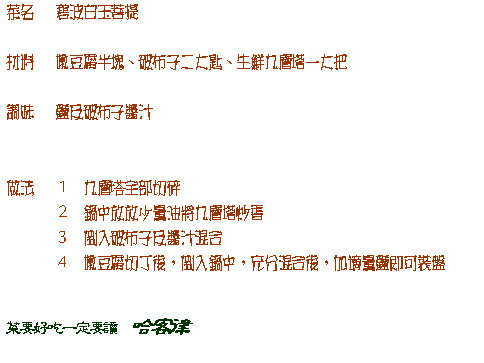 你絕對想不到,九層塔加上破布子,會變出一個讓你味蕾如此興奮的美妙滋味,這是一定要試的超簡單好料,吃到讚的話,記得一定要把心得寫下來,再推薦給大家喔!