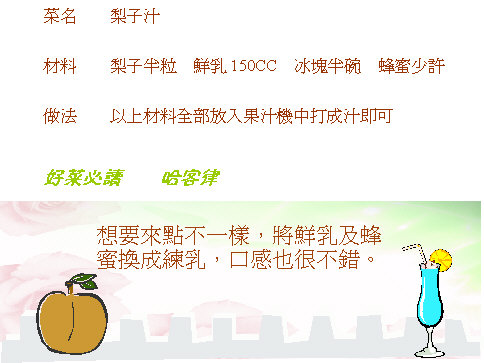 苗栗縣大湖鄉的石門客棧,是由一個專業的寄接梨園區轉型而成的觀光景點,老闆劉德森夫婦開發出來的梨子汁,是該店最受歡迎的特色飲料,淡淡的牛奶香,把梨子的風味襯托得更加迷人。