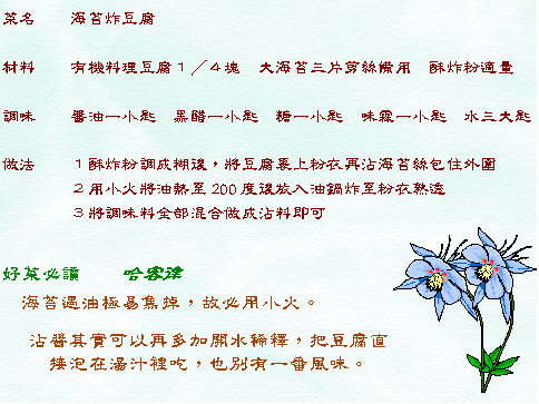 將炸豆腐裹上莓苔來炸,是一次為了討好兒子,情急下變出來的小花樣,當時我只想沾一邊,做成頭髮,還準備用長頭髮的豆腐的故事,和兒子瞎掰一番,但是困難度太高,最後乾脆全部用海苔包起來炸,長頭髮的豆腐硬是變成了扮鬼臉的豆腐,不過重點是這塊扮鬼臉的豆腐味道美得不得了,兒子吃得很高興,從此以後,我們家的豆腐當然就得常常扮鬼臉啦。