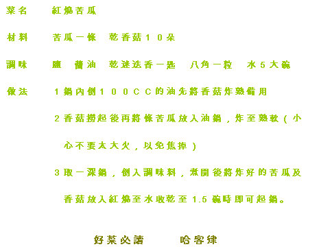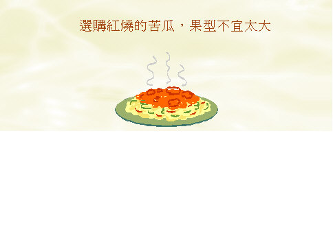 後來阿祖過世,爺爺兄弟早已分家,台灣錢也淹了腳目, 有一次吃素已久的媽媽從朋友那裡學來這道紅燒苦瓜的做法,香醇濃郁的紅燒味,配上苦瓜油炸後展現的難得甘醇,才一上桌,立刻變全家的最愛,常常還沒開動,就被大家瓜分泰半,媽媽因此規定得爺爺、奶奶吃過後,其他人才能動手,苦瓜從此登上我們家桌心的位置.