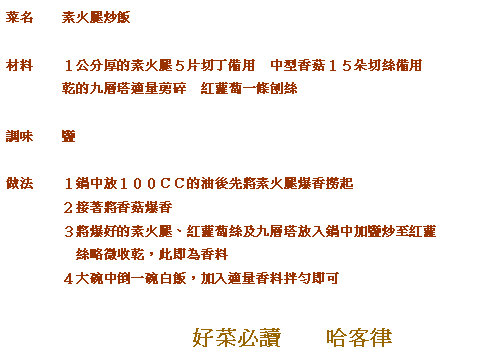 那麼,九層塔和九層塔乾之間有什麼差別呢?嚴格說來,九層塔乾的香氣更濃,更適合用來做特色料理,我喜歡用它來炒飯,出來的炒飯,香氣很足,而且不會膩;我還喜歡用它來煮湯,特有的氣味,讓湯汁格外清甜,我更喜歡用它來做魚香茄子,味道香到令人念念不忘,總之,別具特色,您也不妨試試。